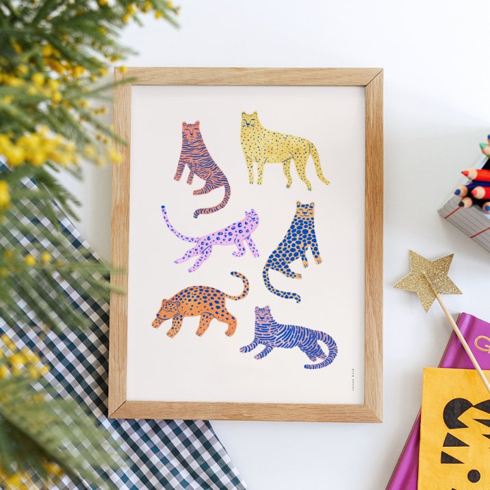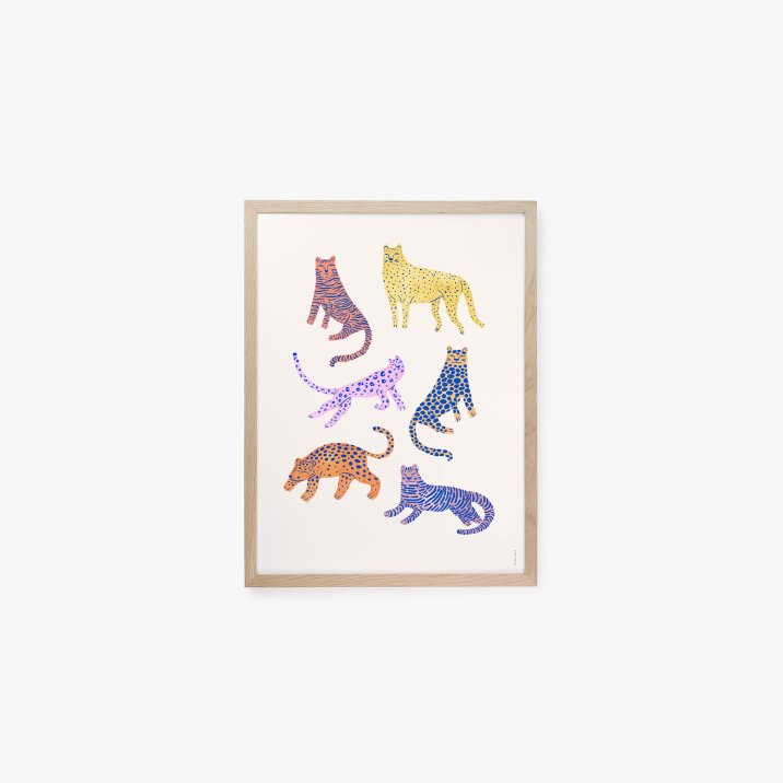 Leopards, tigers, jaguars... the best of the spotted and striped big cats come together on our Big Cats poster. This attractive poster in a patchwork of colours features naively illustrated animals that will add fun and freshness to your décor.
