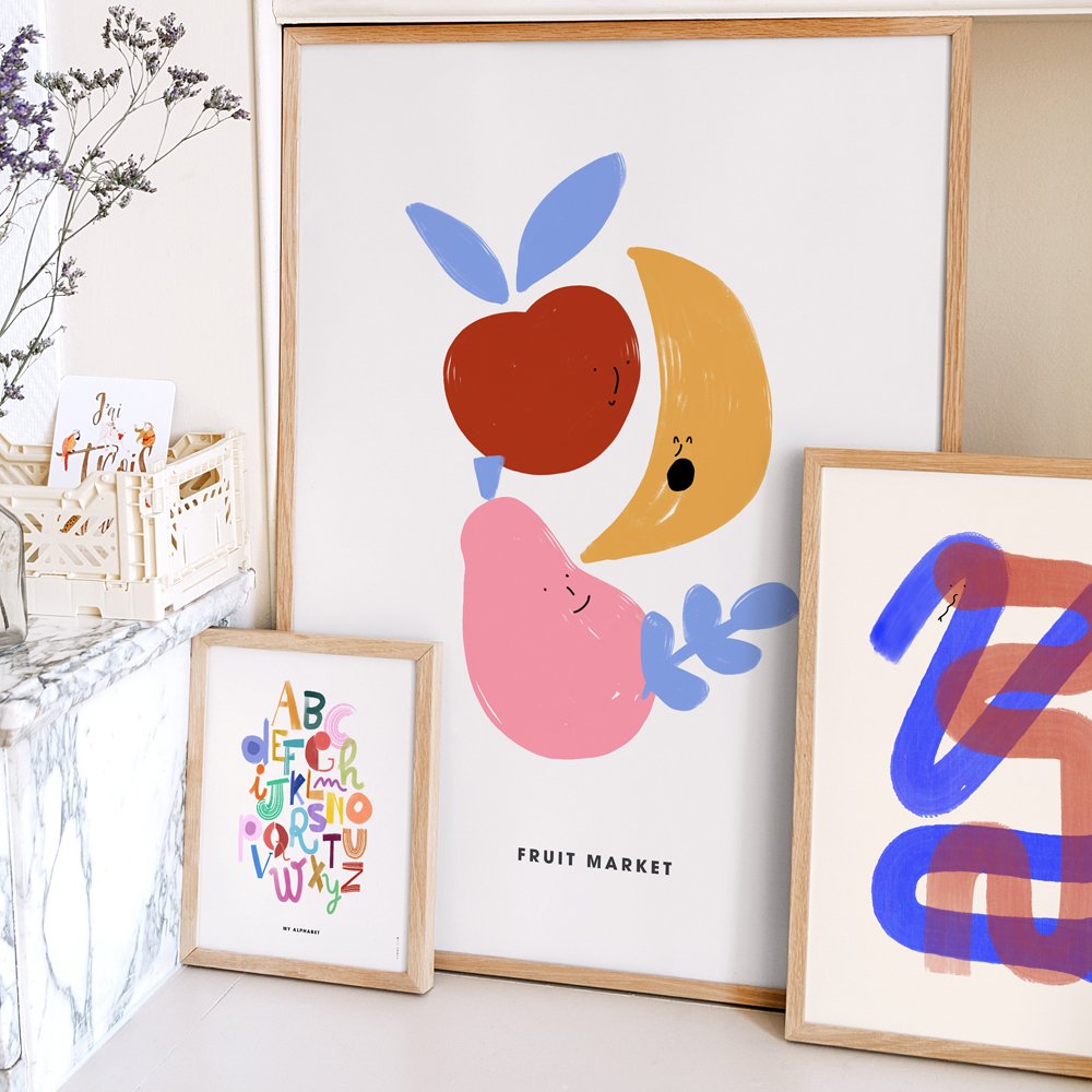 In our Fruity Party illustrated poster, a few colourful shapes and well chosen pencil strokes bring to life funny, fruity characters worthy of a child's imagination. A reworked still life that will add fun and freshness to the room it is displayed in.