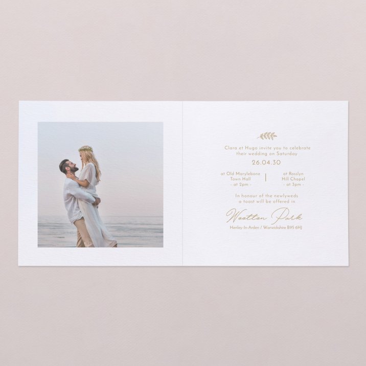 This invitation is a double-sided card, folded in the middle, to personalise with the details of your wedding.