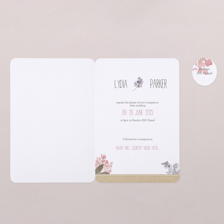 This wedding invitation is made of a folded card. Its classic look is softened with rounded corners. It is enhanced with a round personalised tag, to tie with a nice baker twine (available as an accessory).
