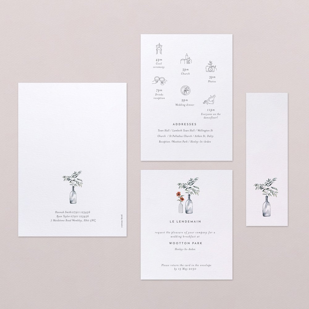 It comprises an invitation, a bookmark and 2 small cards to personalise as you please (order of the day, list of hotels, map, invitation to brunch on the following day, etc.)