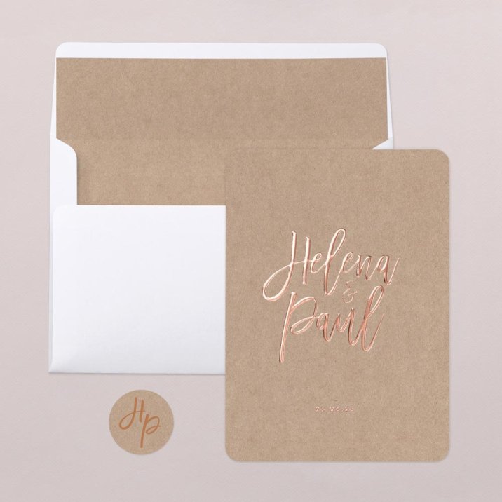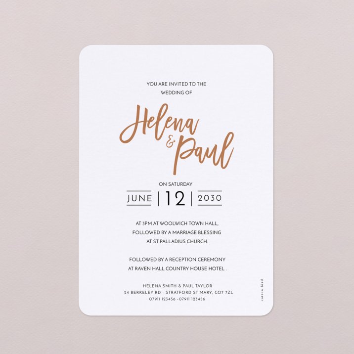 A beautiful hand-written typeface embellished with a copper finish. Invite your loved ones to your wedding with the simple, elegant Ginger invitation.