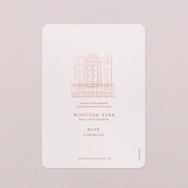 This invitation is a double-sided card in portrait format. It has rounded corners to echo the soft feel of your wedding announcement.