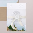 This wedding invitation is made of a single customisable card, wrapped in translucent vellum paper.