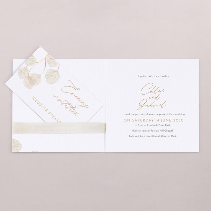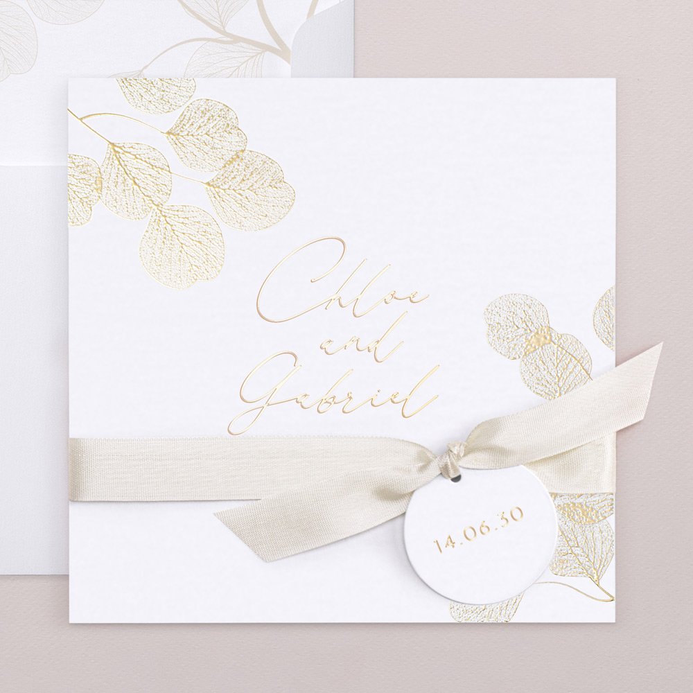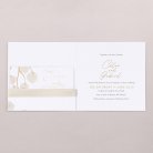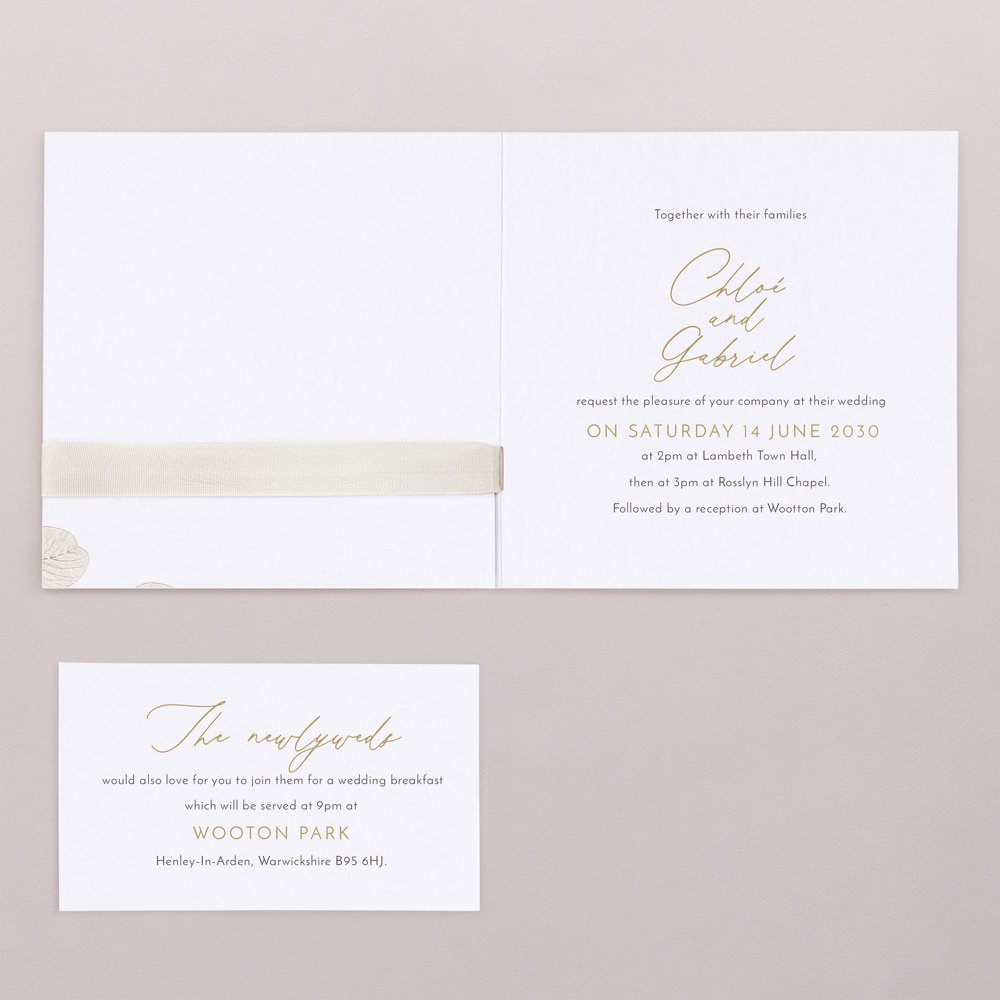 This model comprises an invitation and an evening invitation to slip inside. There are perforations for threading through a pretty ribbon (optional extra) with a tag, the little detail that makes all the difference.