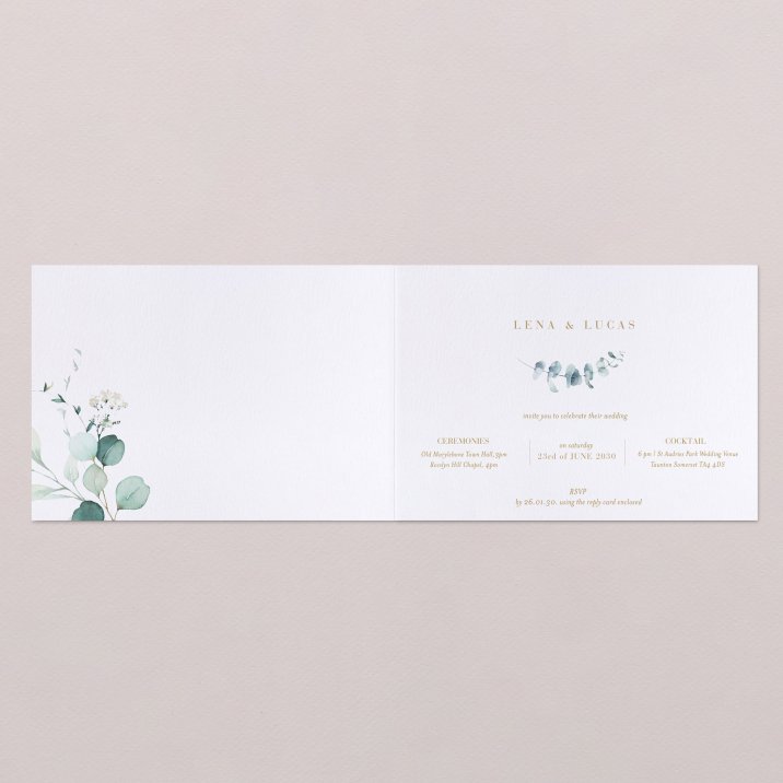Elegance and simplicity are the keywords for the Golden Leaves wedding invitation. With its golden wreath, highlighted by watercolour olive tree leaves, this design with subtle nature's touched will set the tone for an exceptional ceremony.