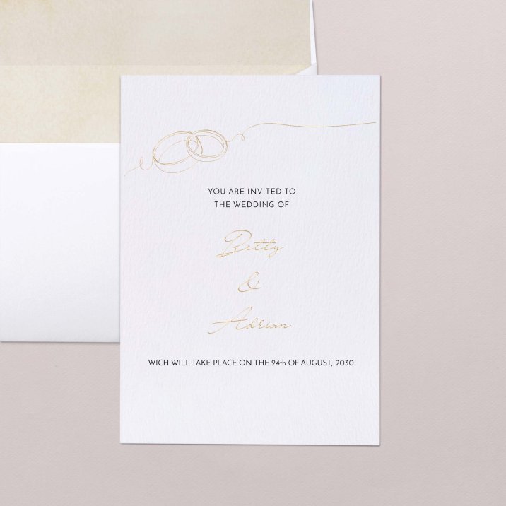 The bride and groom's wedding rings are dressed in gold on the Promesse wedding invitation. A precious creation, ideal to share your happiness with elegance.