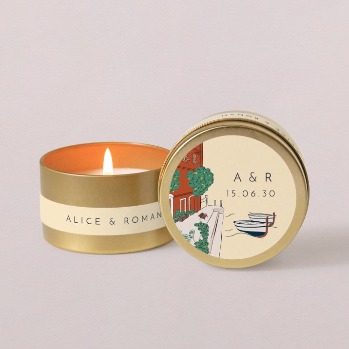 Our golden candle is the perfect wedding favour for your guests! Its delicate fig tree scent will take them back to the precious memories of your special day.