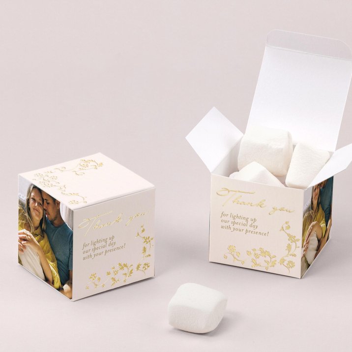 This little box measuring 5.4 x 5.4 cm is perfect for sweets or other little gifts. Give them to your guests as a souvenir of your wedding.