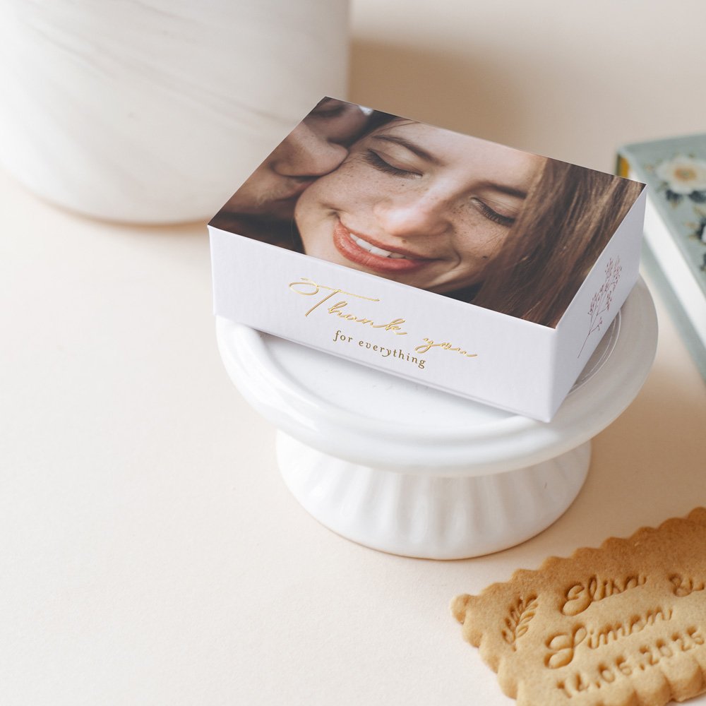 Specially designed, for 7x5cm biscuits, this box can contain up to 4. Assemble your boxes, then fill them with your personalised handmade biscuits! Share your recipe with us if you're especially proud of them. We do not provide the biscuits, we simply make the beautiful paper boxes that match your whole wedding stationery.