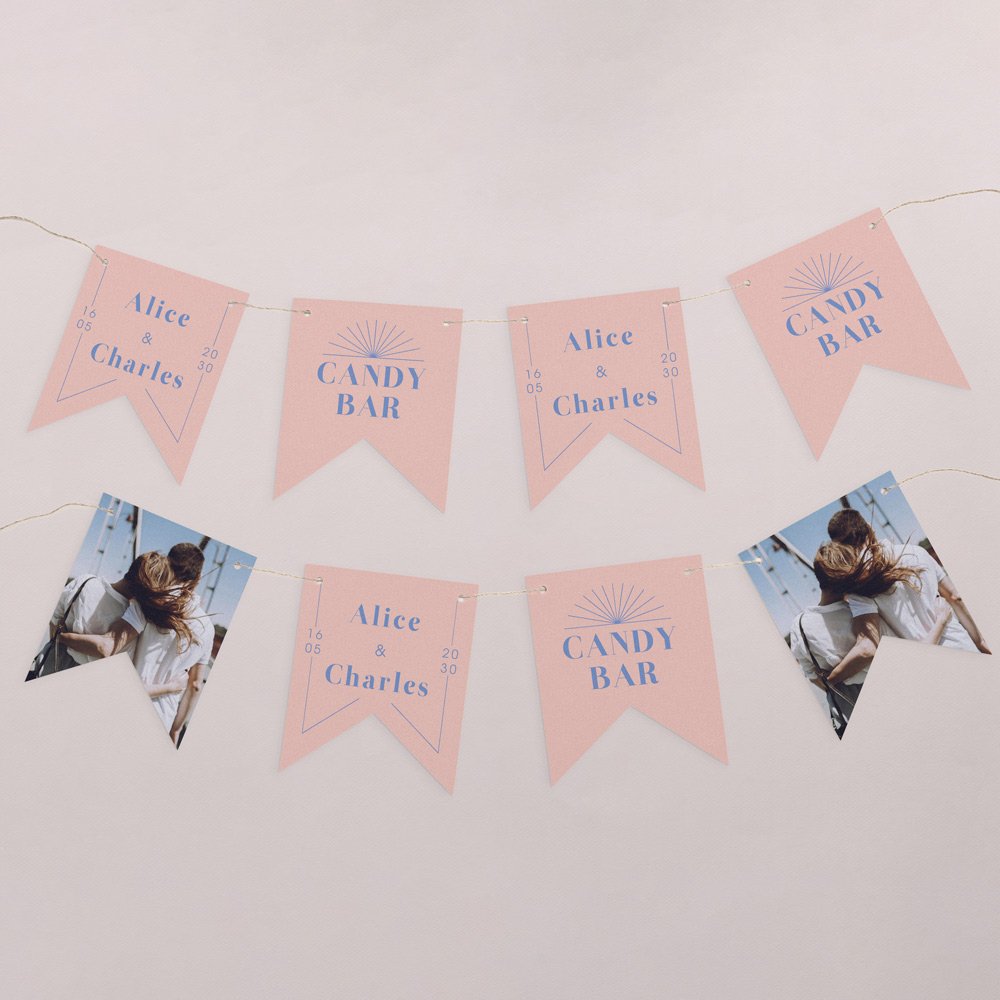 This garland made of 16 flags front and back can be personalised with your names, the photo of your couple, the date of your wedding, a little welcome note... The customisation continues with the choice of the string with two colours: natural or blanc/gold. We also offer to pimp them up a bit with beige or soft pink pompoms (to add as an option. Pompoms come by batch of 15).