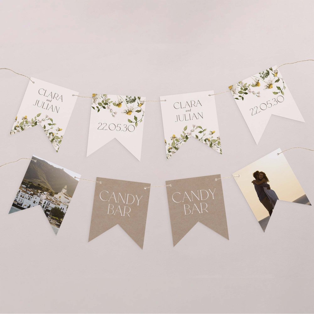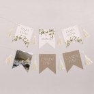 This garland made of 16 flags front and back can be personalised with your names, the photo of your couple, the date of your wedding, a little welcome note... The customisation continues with the choice of the string with two colours: natural or blanc/gold. We also offer to pimp them up a bit with beige or soft pink pompoms (to add as an option. Pompoms come by batch of 15).