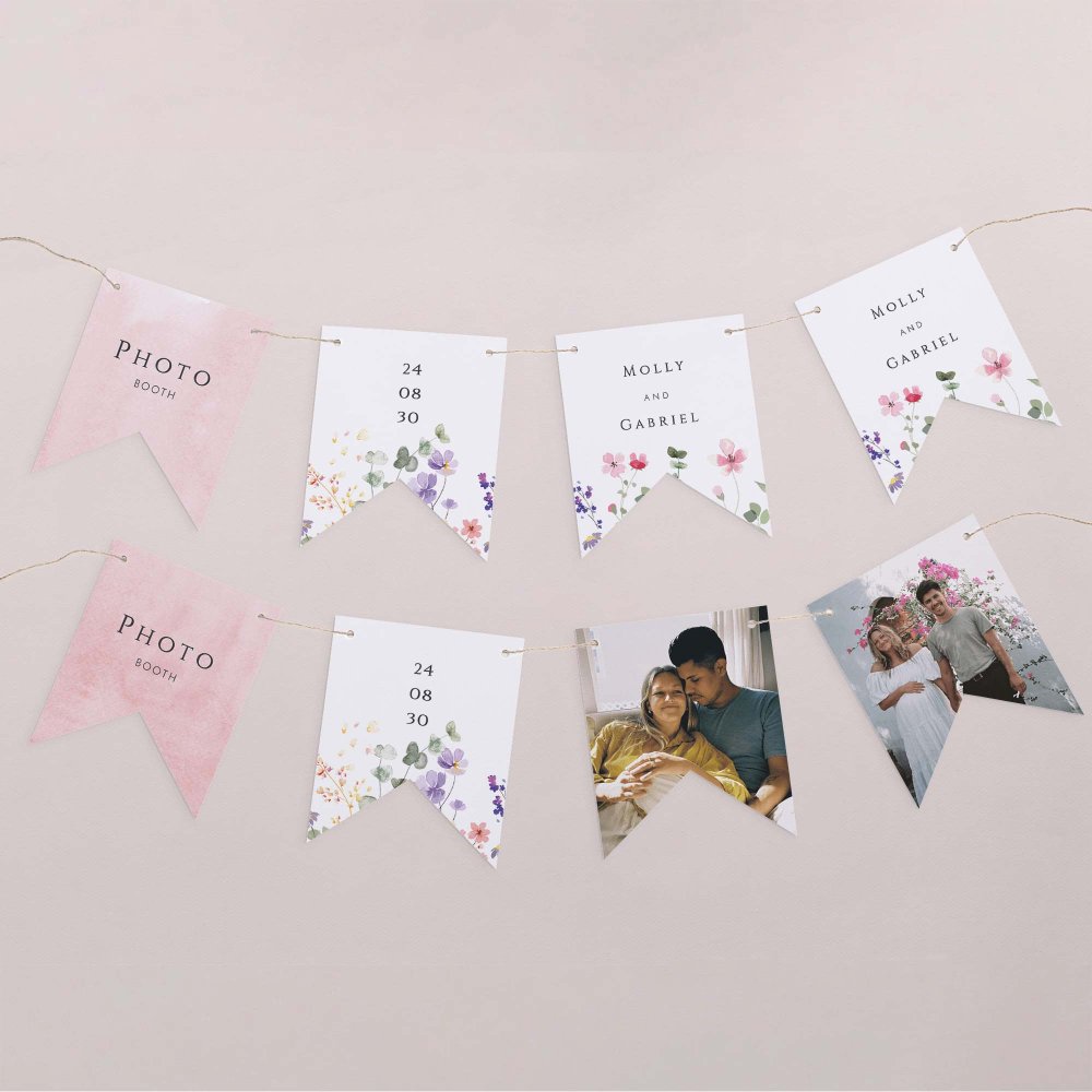 This garland made of 16 flags front and back can be personalised with your names, the photo of your couple, the date of your wedding, a little welcome note... The customisation continues with the choice of the string with two colours: natural or blanc/gold. We also offer to pimp them up a bit with beige or soft pink pompoms (to add as an option. Pompoms come by batch of 15).