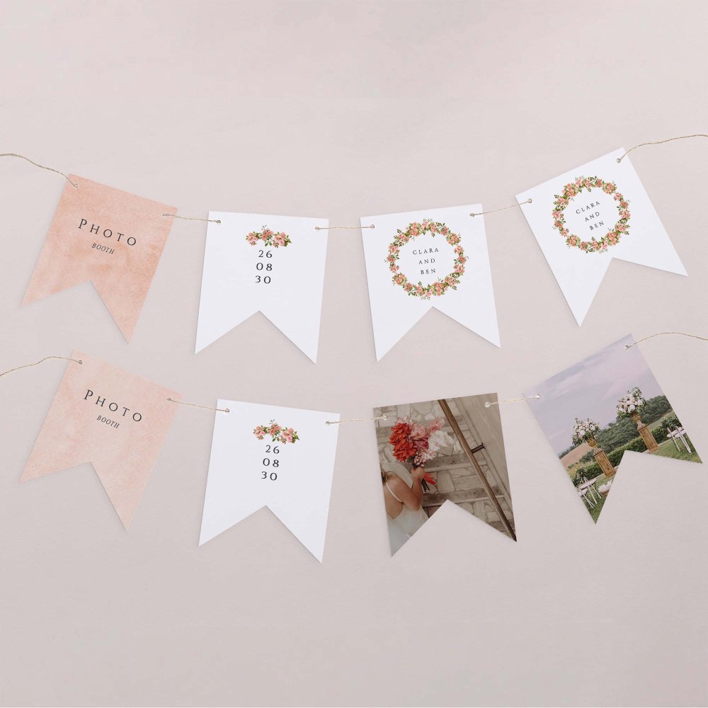 This garland made of 16 flags front and back can be personalised with your names, the photo of your couple, the date of your wedding, a little welcome note... The customisation continues with the choice of the string with two colours: natural or blanc/gold. We also offer to pimp them up a bit with beige or soft pink pompoms (to add as an option. Pompoms come by batch of 15).