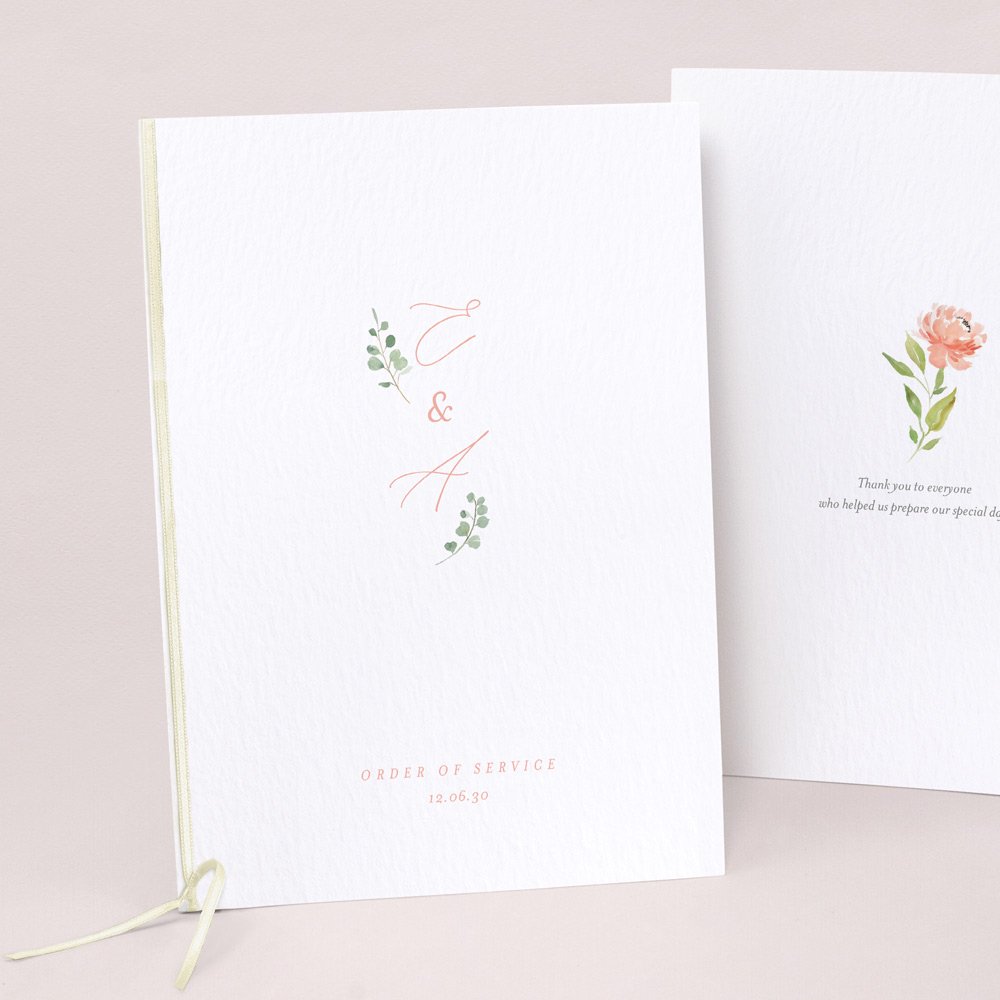 Order of service cover to match your invitations, trimmed with a ribbon (optional extra in the colour of your choice). The inner pages are not supplied.