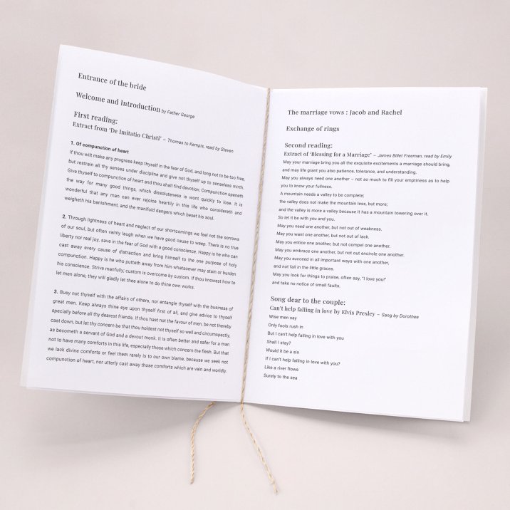 Order of service cover to match your invitations, trimmed with a ribbon (optional extra in the colour of your choice). The inner pages are not supplied.