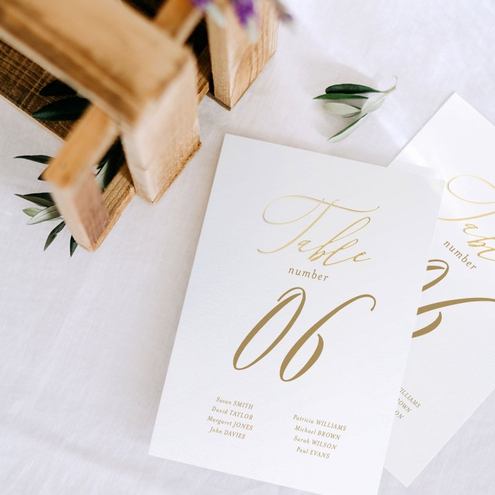 One card for each table, displayed at the room entrance to help your guests find their table with ease.