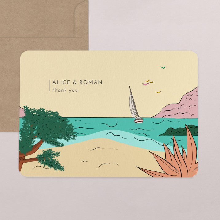 A large souvenir thank you card. The perfect way to thank your friends and family, and remind them of the special day you spent together. Can be personalised on both sides.