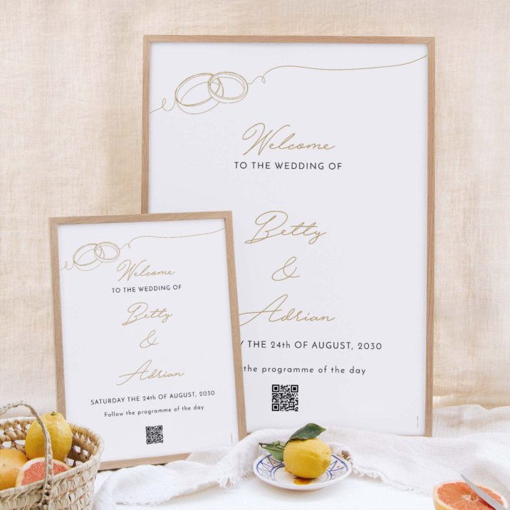 To decorate your venue, welcome your guests and help them find their way throughout the day nothing works best than customised signs! Change and multiply the sign as you wish: "Welcome", "Bar", "Drinks this way", "Sit wherever you want", "Send us on our honeymoon". Let your imagination run wild and write what you want on these pretty wedding signs! Our personal tip: For a mind-blowing effect on your guests, pick a 40x50 cm frame and for an extra je ne sais quoi to showcase your sign: add a patterned mount. The 30x40 cm frames match the dimensions of our standard signs. To be displayed in a frame or to be hanged with our oak poster holders (accessories sold separately. Add them as options).