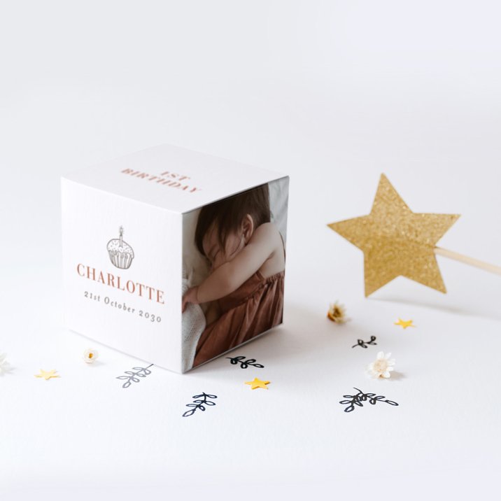 Assortment of sweets and other treats, mini toys, charms or fancy jewellery... let your creativity run wild to fill your cube with little gifts and personalise it with your child's name along with their birthday details (date, age, etc.) and a little thank you message.