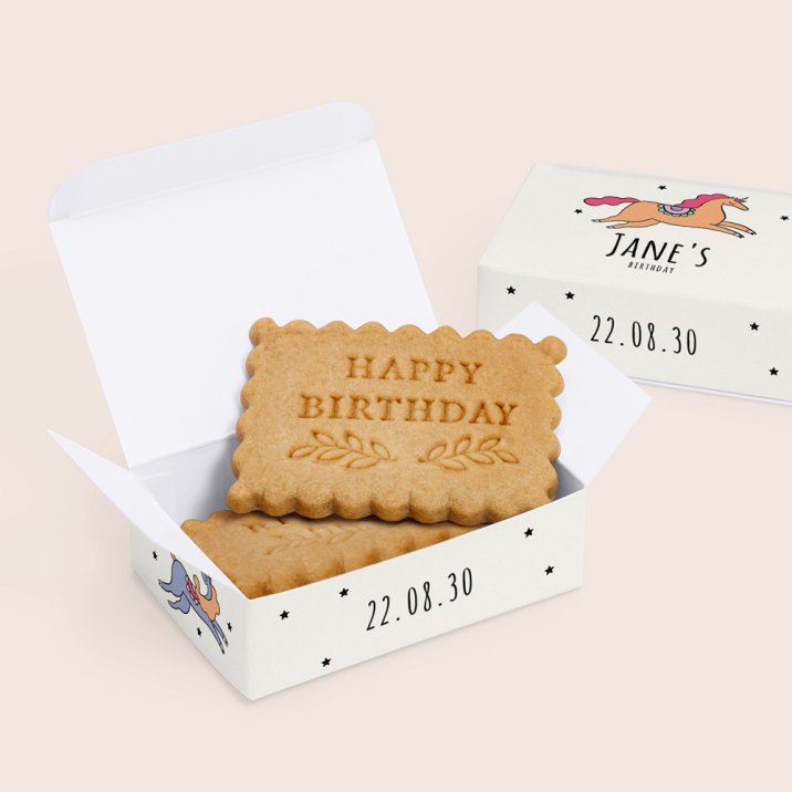Specially designed, for 7x5cm biscuits, this box can contain up to 4. Assemble your boxes, then fill them with your personalised handmade biscuits! Share your recipe with us if you're especially proud of them. We do not provide the biscuits, we simply make the beautiful paper boxes that match your whole birthday stationery.
