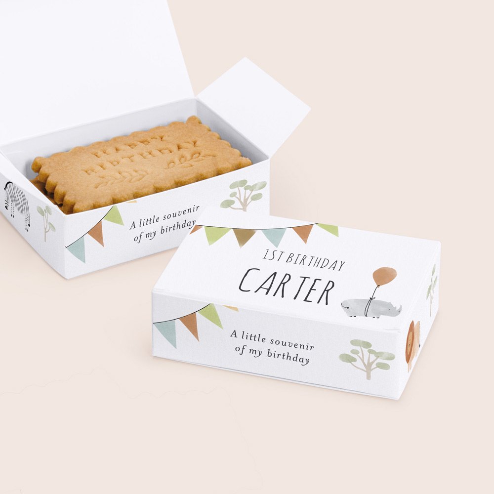Specially designed, for 7x5cm biscuits, this box can contain up to 4. Assemble your boxes, then fill them with your personalised handmade biscuits! Share your recipe with us if you're especially proud of them. We do not provide the biscuits, we simply make the beautiful paper boxes that match your whole birthday stationery.