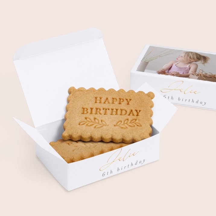 Specially designed, for 7x5cm biscuits, this box can contain up to 4. Assemble your boxes, then fill them with your personalised handmade biscuits! Share your recipe with us if you're especially proud of them. We do not provide the biscuits, we simply make the beautiful paper boxes that match your whole birthday stationery.