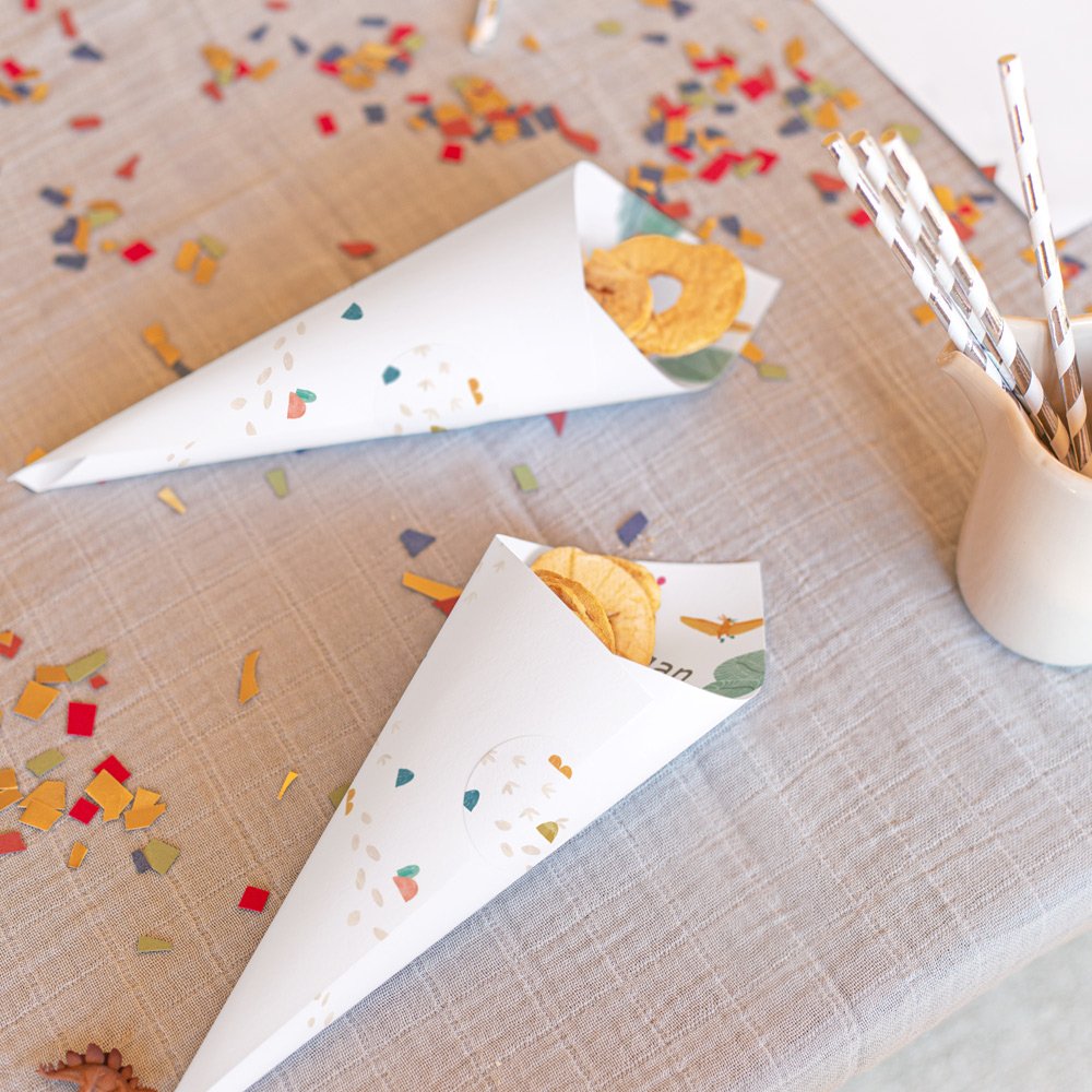 Streamers and party poppers to make your party go with a bang, packs of coloured pencils for creative workshops, sweet treats such as popcorn or marshmallows, mini gifts... the possibilities are endless for filling your cones with little surprises to delight your party guests!