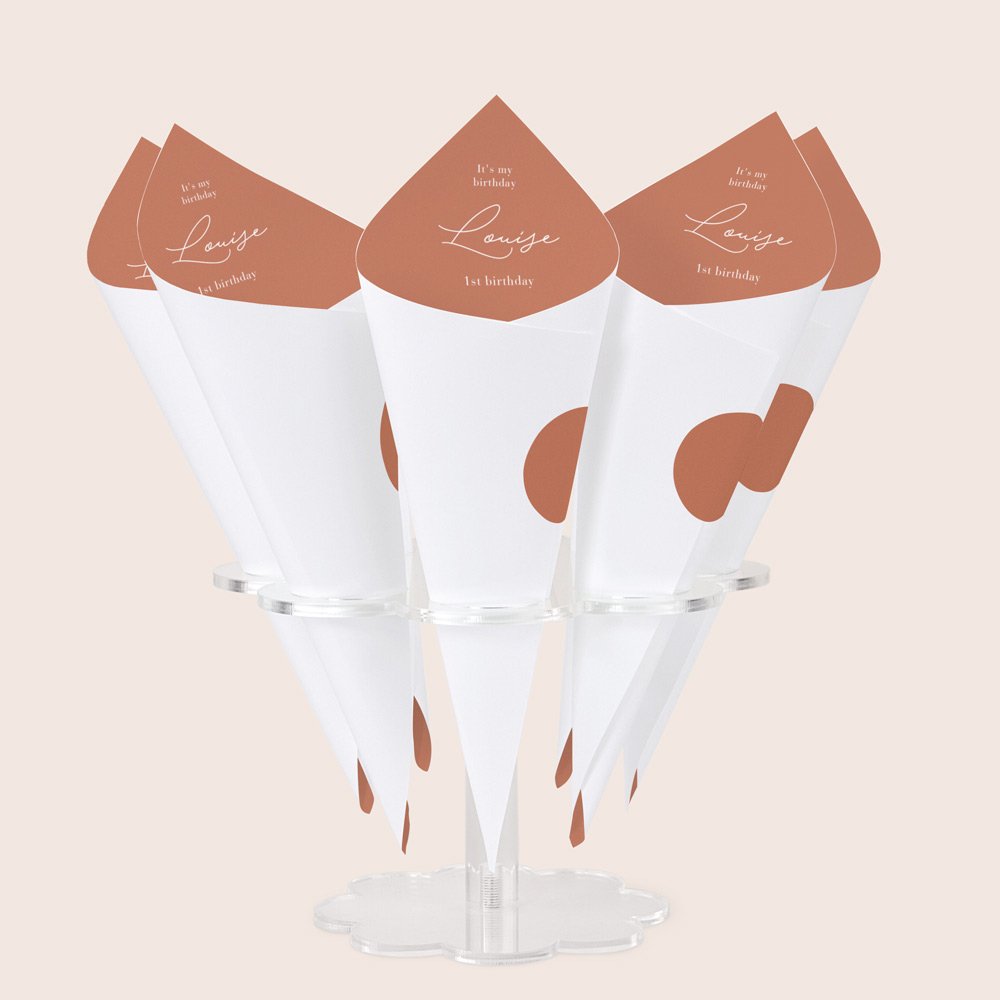 For a practical way to display your cones, we recommend placing them in a cone stand (optional extra), depending on the number of guests. You can put up to 8 cones on a stand.
