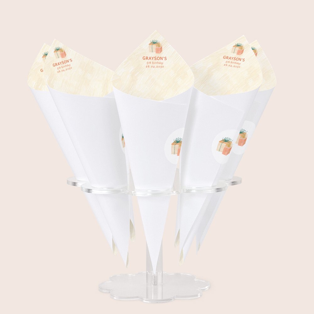 For a practical way to display your cones, we recommend placing them in a cone stand (optional extra), depending on the number of guests. You can put up to 8 cones on a stand.