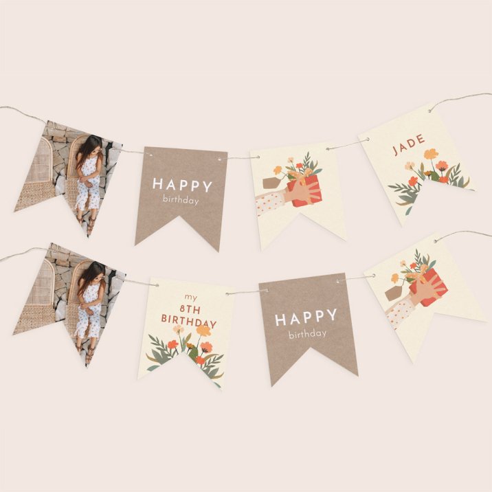 This double-sided 16-piece bunting garland can be personalised with a photo of your child, their name, age, a little party message... it's up to you!