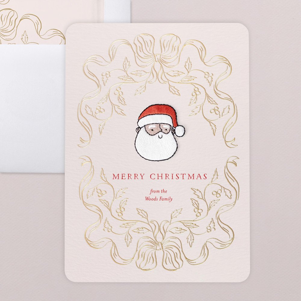 On the Precious ribbon greeting card, elegant ribbons and golden holly branches frame an embroidered character. This original design will immerse your loved ones in the magic of the festive season as soon as they open the post.