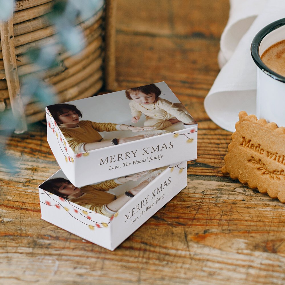 Specially designed, for 7x5cm biscuits, this box can contain up to 4. Assemble your boxes, then fill them with your personalised handmade biscuits! Share your recipe with us if you're especially proud of them. We do not provide the biscuits, we simply make the beautiful paper boxes that match your whole Christmas stationery.